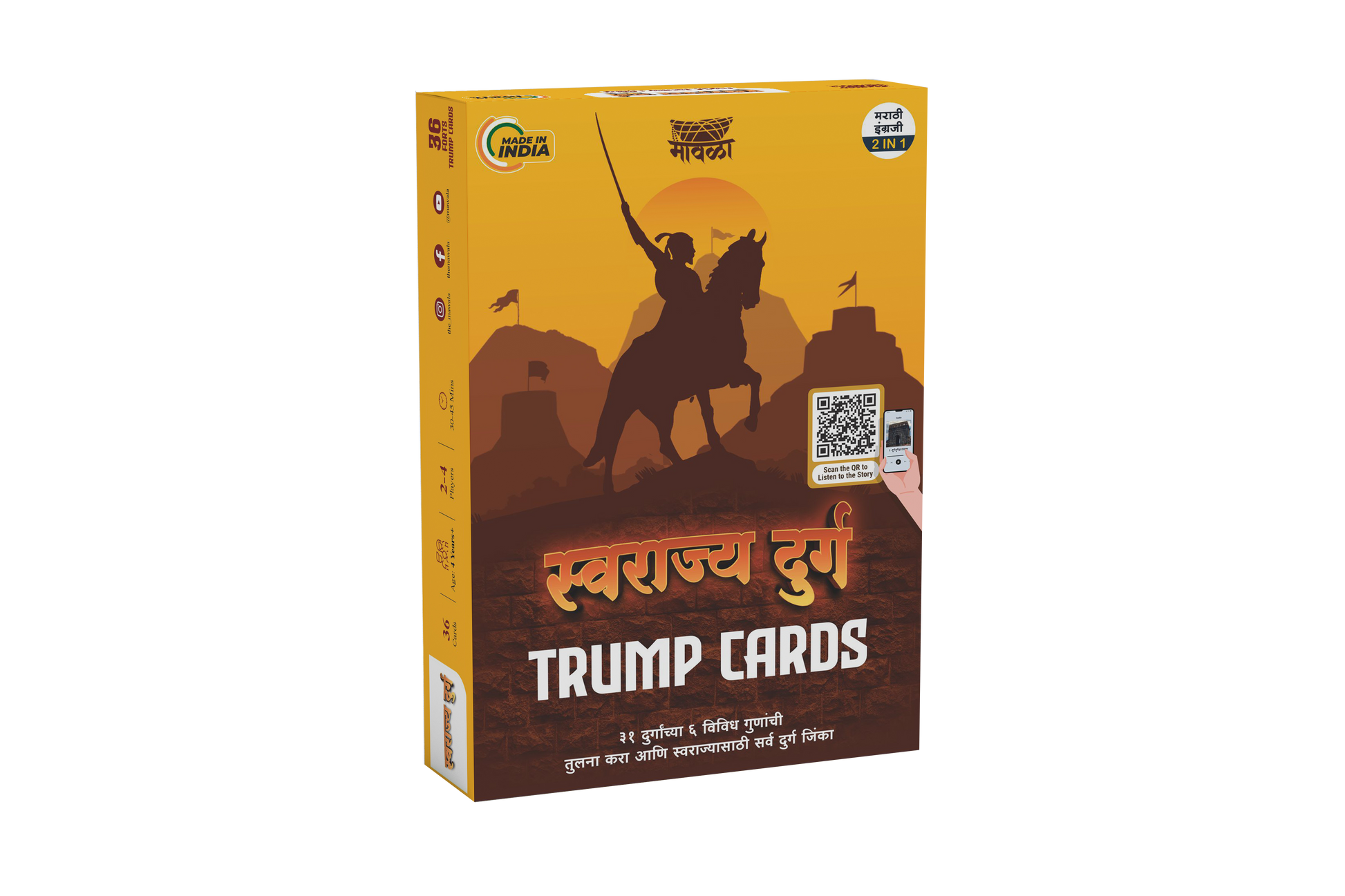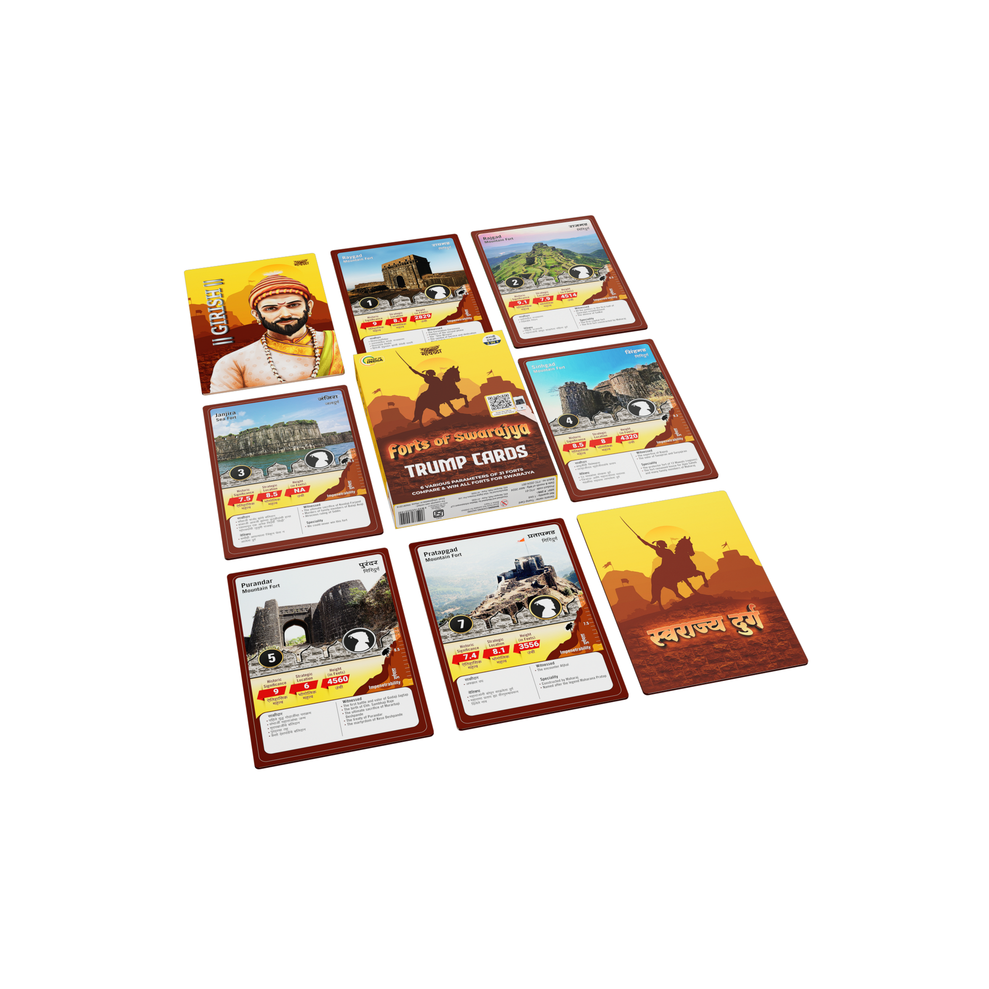 • Significance Cards: 2 cards that elaborate on the importance of the forts as articulated by Shiv Chhatrapati. Available in both Marathi and English. Insightful explanations about the strategic, cultural, and historical relevance of the forts in the context of Swarajya.